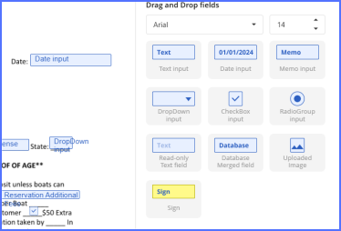 The contract editor allows users to create or modify contract templates with ease. You can import MS Word documents or PDFs and use drag-and-drop field templates to place elements anywhere in the contract. Fields can include database merge fields, customer entry fields, date fields, and more.